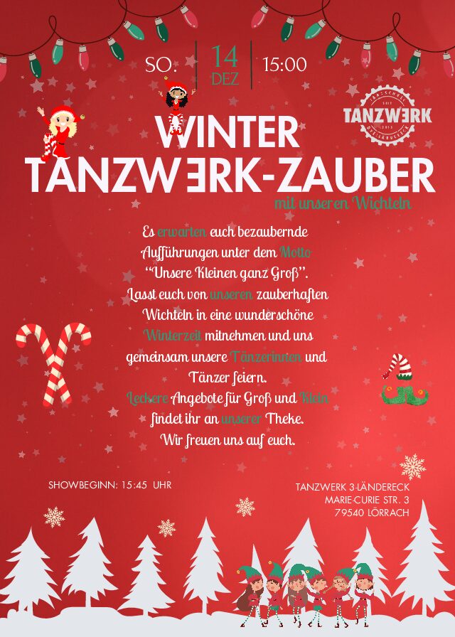 Es erwarten euch bezaubernde Aufführungen unter dem Motto „Unsere Kleinen ganz gross“. Lasst euch von uns in eine zauberhafte Winterzeit mitnehmen und uns gemeinsam unsere Tänzerinnen und Tänzer feiern.